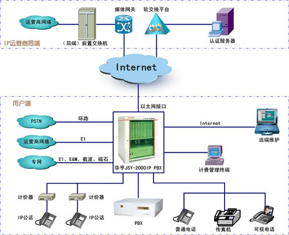 华亨IP语音交换机(JSY-2000 IP PBX):将VOIP语音网关和数字程控交换机结合为一体;宽带接入方式完善、接口丰富、信令齐全;符合H.323、SIP和G.77、G0279.A、T.38等语音和压缩标准;可同时接入公网和运营商网络,并能实现:智能旁路、智能补网、经济路由、等位拨号、拨帐号密码落地、断电直通、一机多号等;具备数字程控交换机的上百种程控功能。