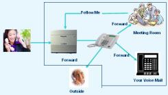外线直接接入、内线呼叫和转移到您的分机上的呼叫都可以在您使用电话或离开座位时被前转到另一个目的地。呼叫可以被指向到一个预编号的号码,如您的语音信箱、或者另一部话机、甚至是一个外线号码。此功能可用来提高效率并提供全方位的用户服务。“跟随我”设置允许您从办公室内(如会议室)的其它分机上远程设置您自己分机的呼叫前转功能,这样,在您离开您的座位时,到达您的分机上的呼叫也可以找到您。