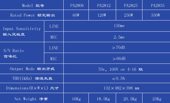 * 2路话筒输入,1路AUX输入;100V、70V定压输出和4欧-16欧定阻输出;5单元LED电平表。